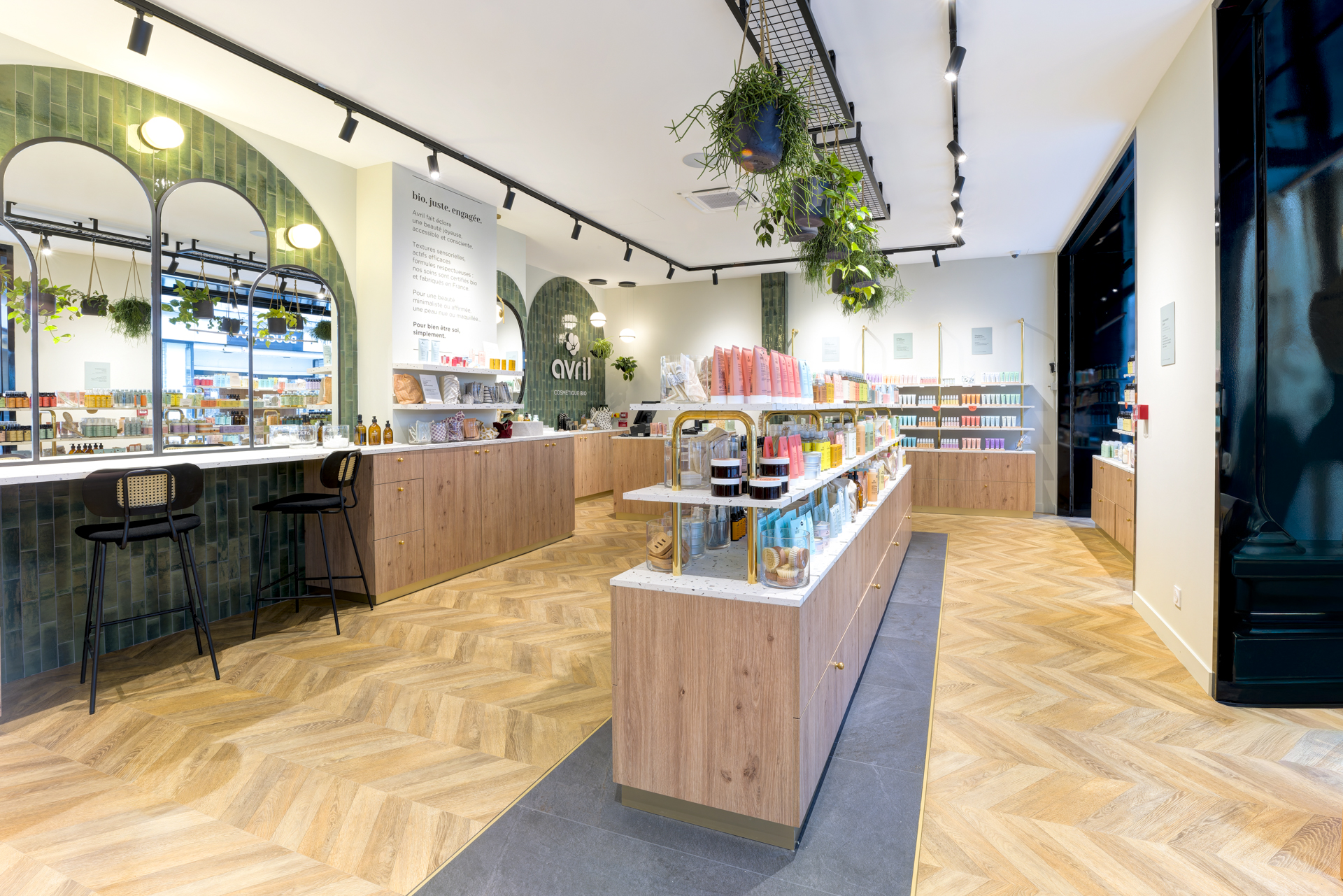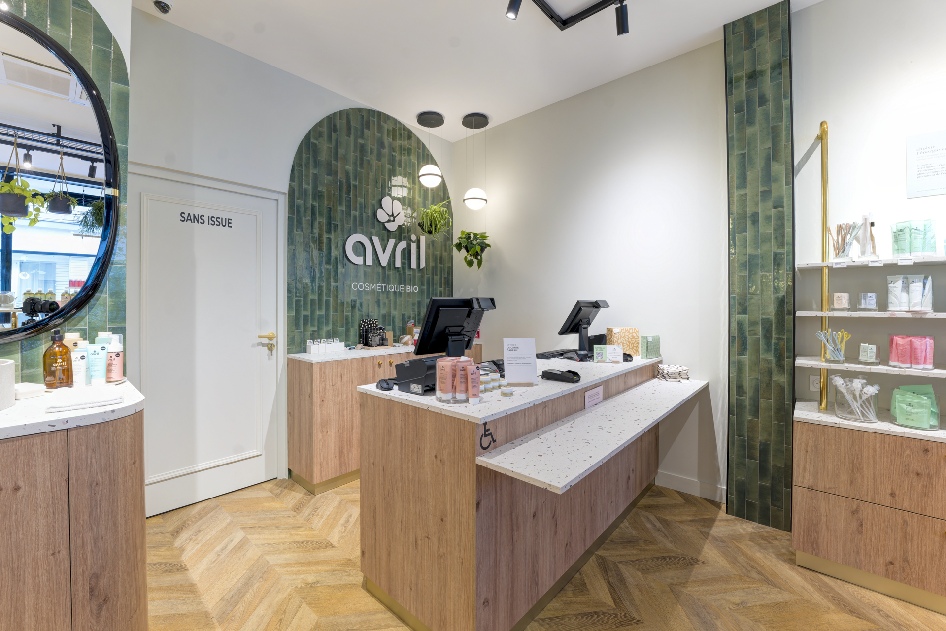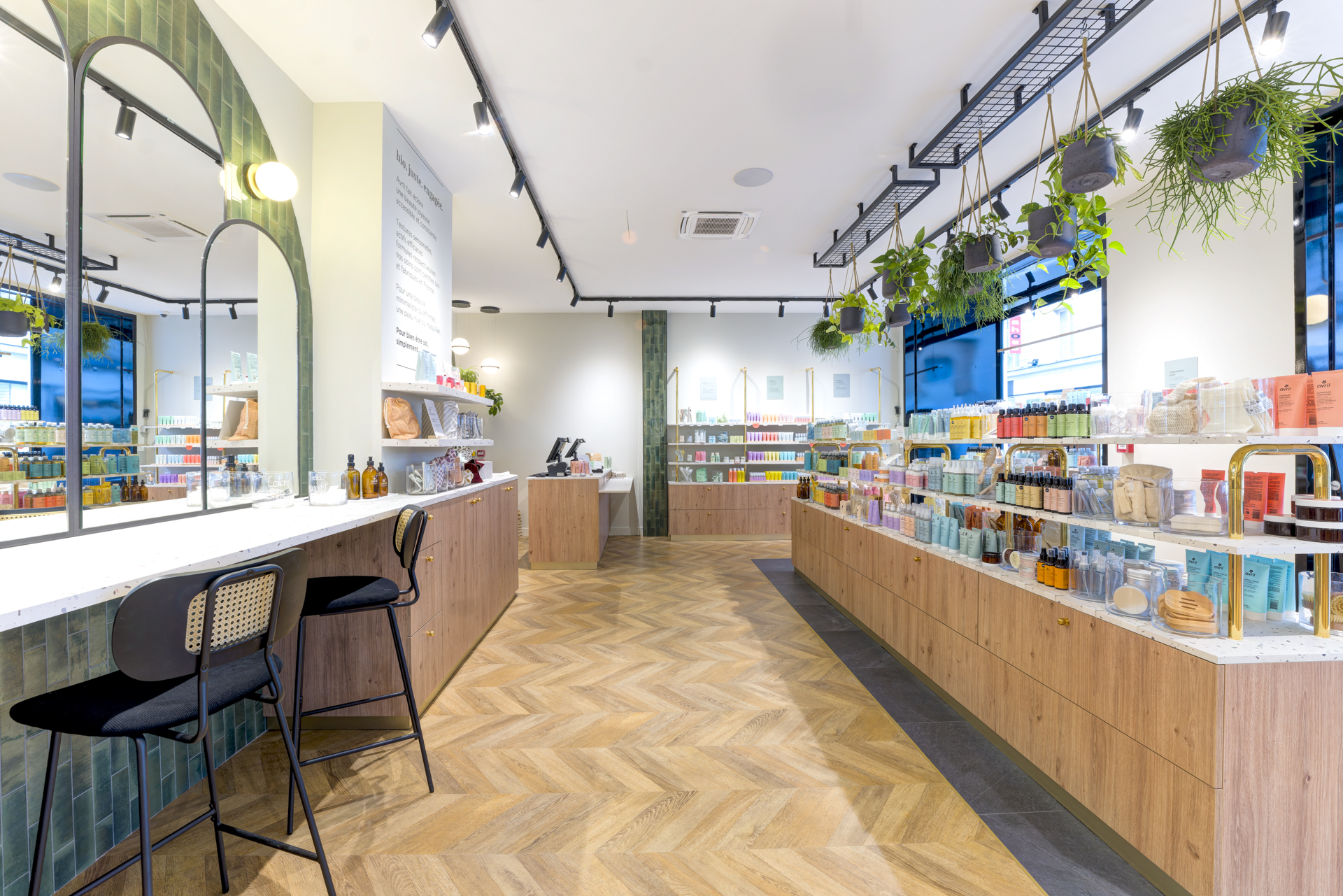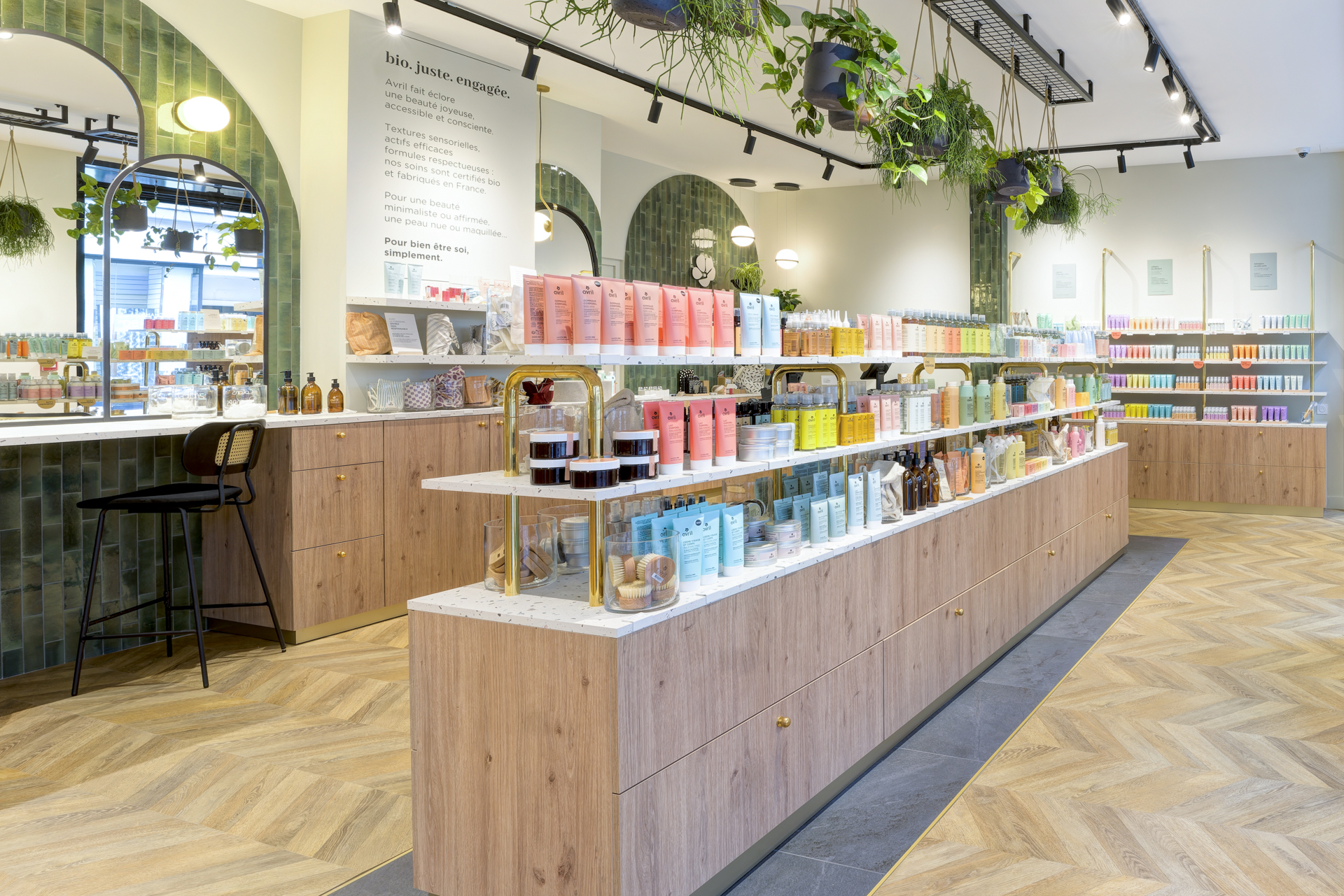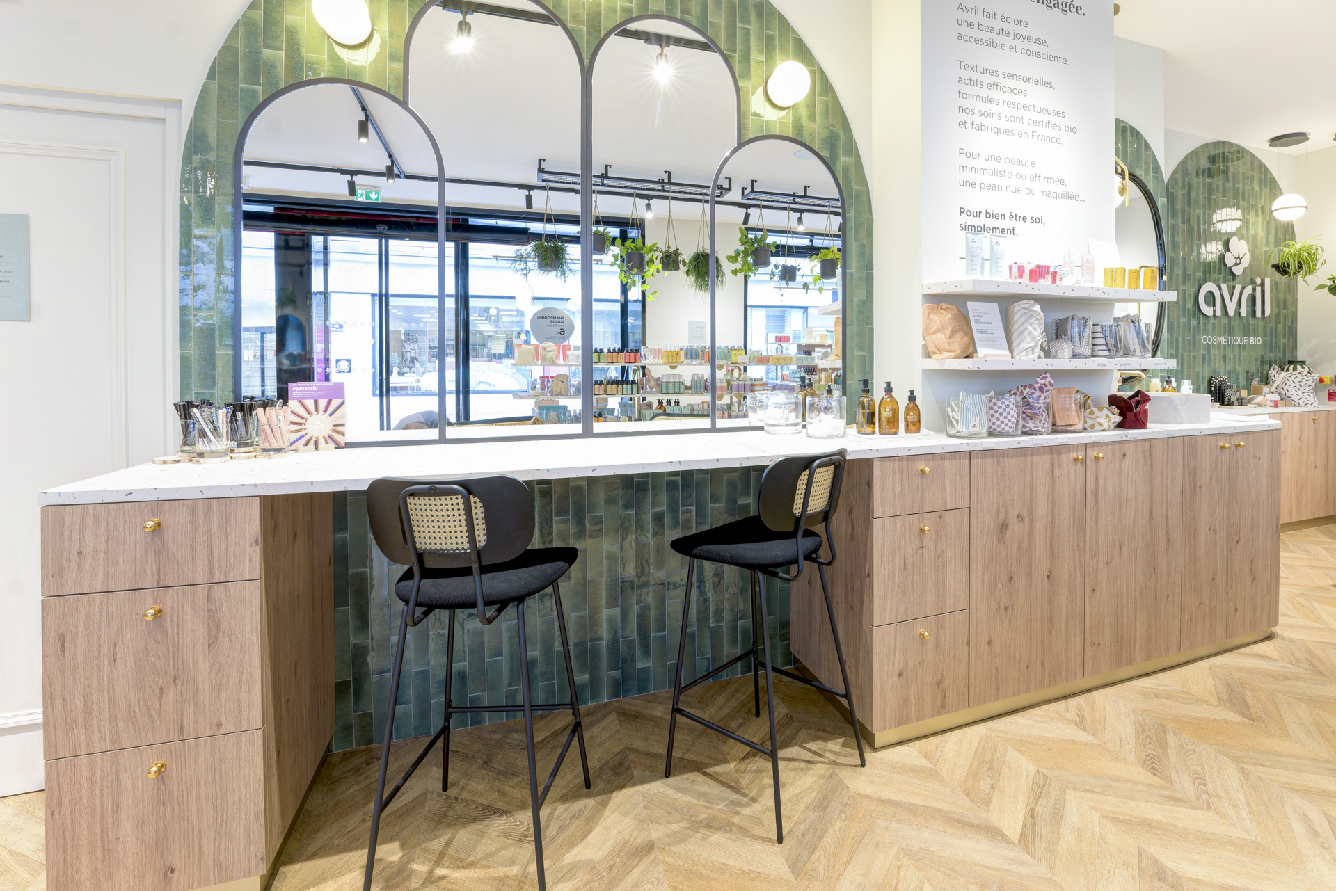Les arches murales habillées de carreaux zellige vert profond structurent l’espace et renforcent l’identité visuelle, évoquant le monde végétal propre à la cosmétique bio.