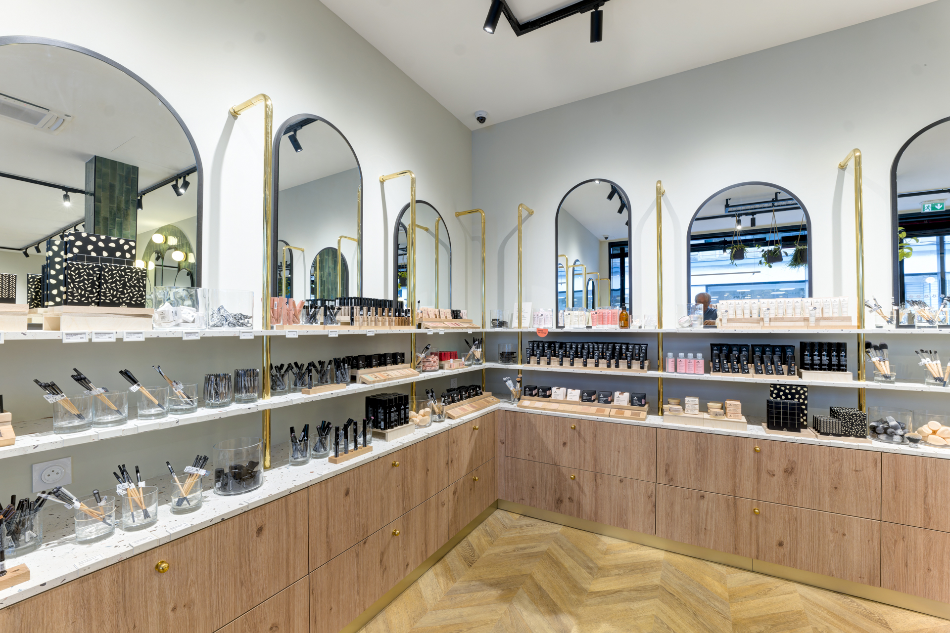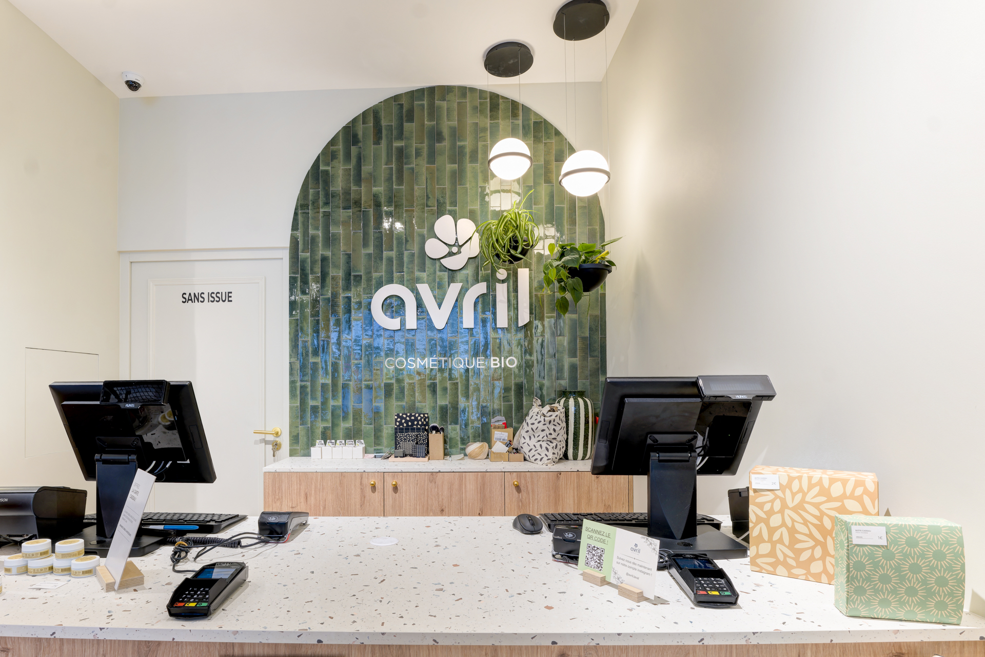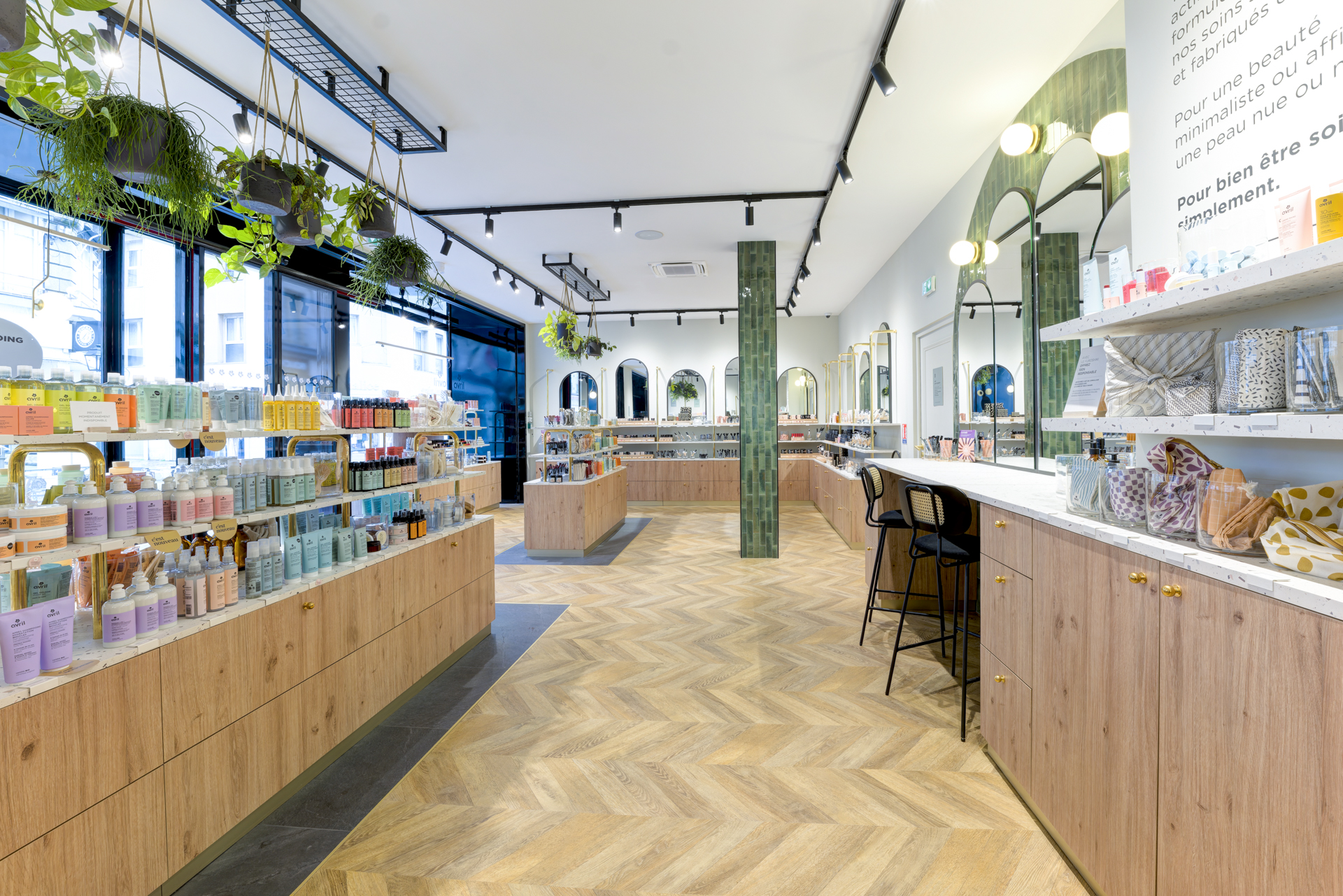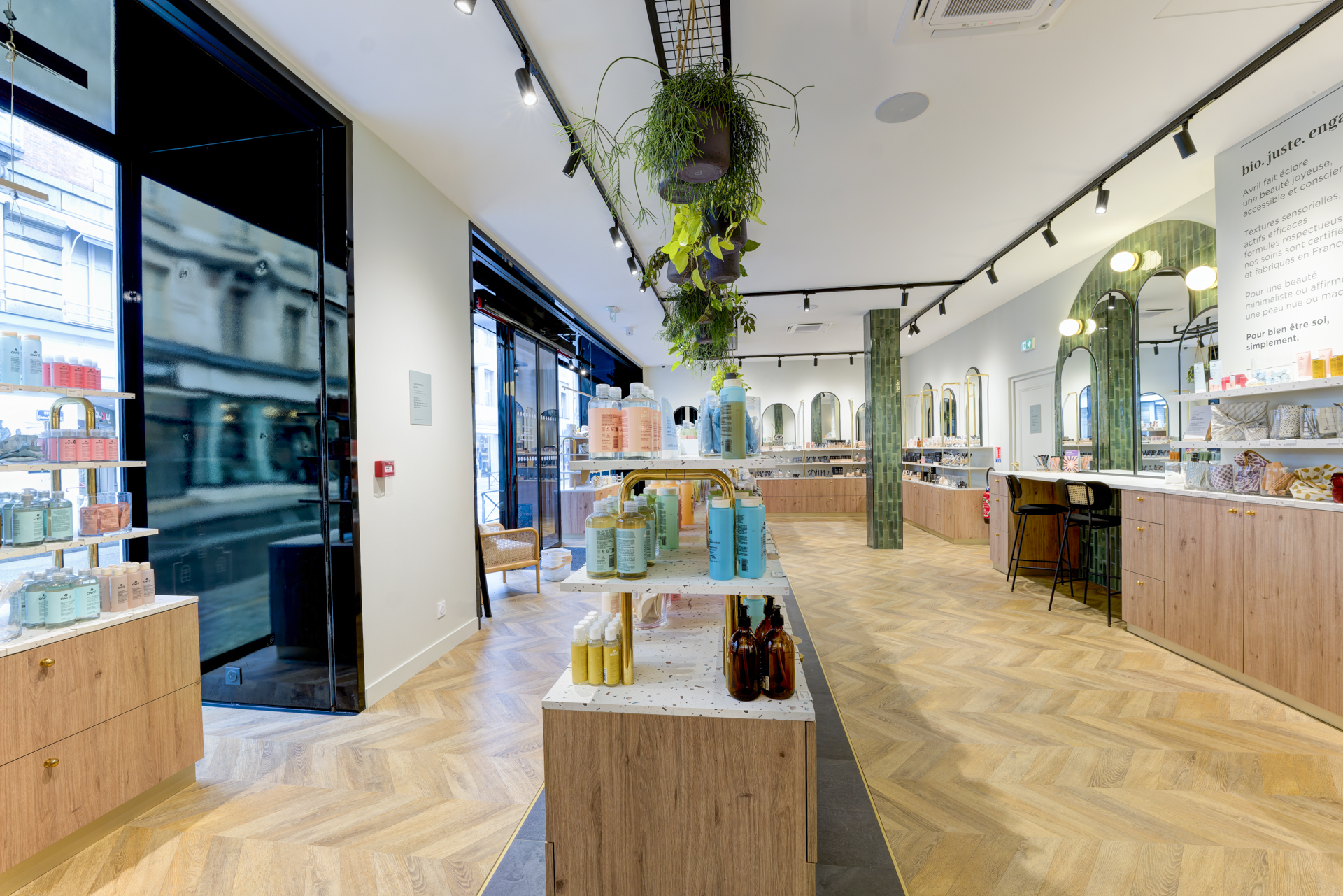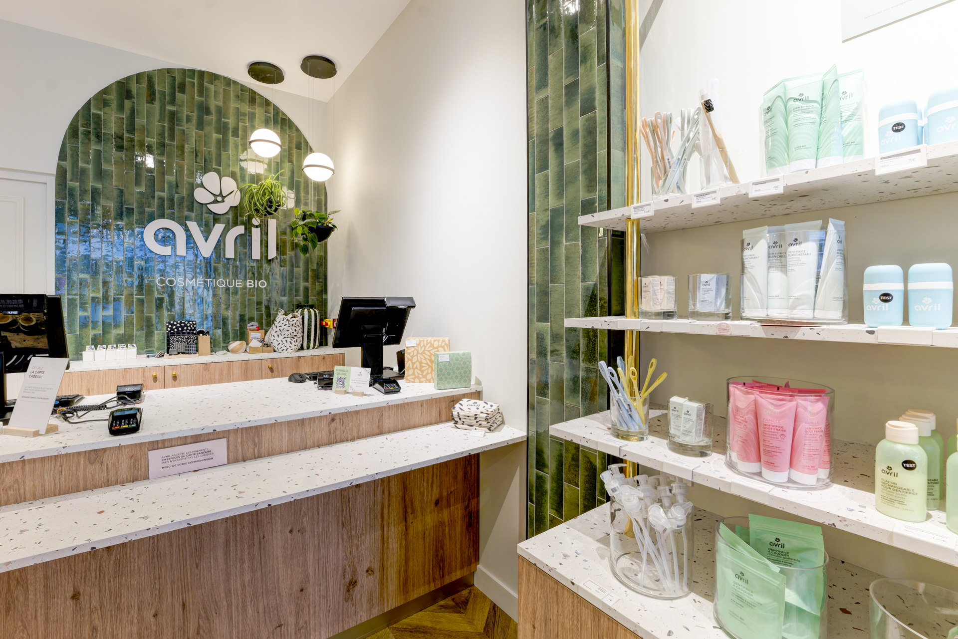 Les arches murales habillées de carreaux zellige vert profond structurent l’espace et renforcent l’identité visuelle, évoquant le monde végétal propre à la cosmétique bio.