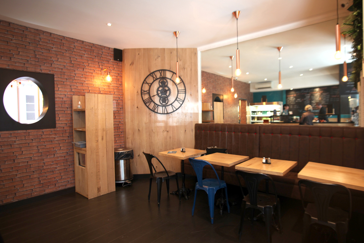 Le but était de rénover complètement le local (ancien bar de quartier abandonné depuis de nombreuses années). Il fallait revoir totalement la devanture et faire les démarches administratives auprès de l’urbanisme. Il fallait créer un espace de service pour la prise de commande et permettre aux clients un cheminement fluide dans le restaurant pour y manger sur place ou bien à emporter.