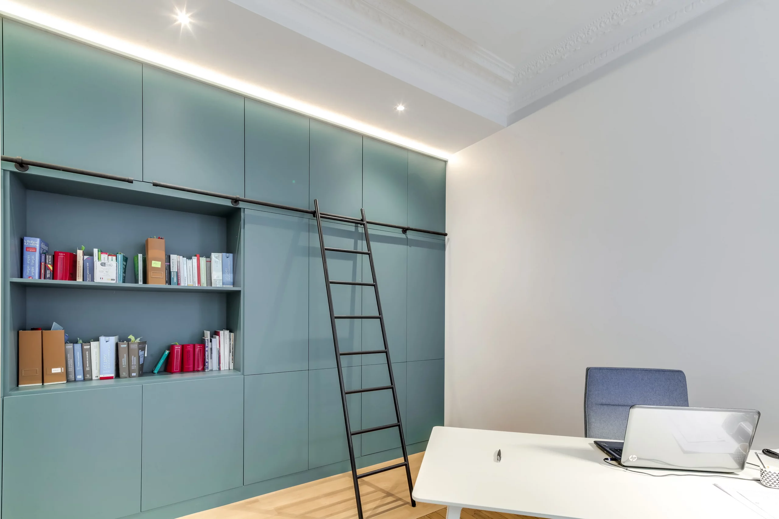 Après : Un cabinet d’avocat de 170m² comprenant une entrée, une salle de réunion, 4 bureaux, une kitchenette, un espace copieur/archives et des sanitaires.